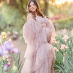 Bay Area Family Photographer Xio Ponce Bay Area Family Photographer photo of pregnat mom in a Irish garden with a pink dress and flowers.